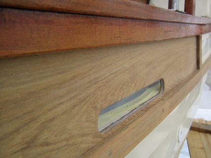 Parraslistojen kyllästämiseen käytimme Owatrol I öljyä. Tämän jälkeen parraslistat lakattiin kahdeksan kertaa Le Tonkinois lakalla. Olemme käsitelleet hytin kyseisellä lakalla kahtena keväänä ja olleet erittäin tyytyväisiä lopputulokseen. Lopuksi laitettiin vielä parraslistan ja tiikkikannen väliin mustaa Würthin tiivistemassaa.
