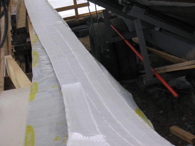 Käytimme laminointiin 300 grammaa neliöltä painavaa lasikuitumattoa. Laminointi alkoi tasaisella alustalla suoraan tiikkiviilun päälle. Viimeisen kerroksen laminoimme muotoonsa vanhan parraslistan päällä. Yhteensä laminointiin kului hartsia 25 kiloa.