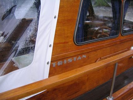 Uusissa Tristaneissa logot kiinnitetään veneen sivuille tiivistemassalla. Puuhytilliseen veneeseen logoja ei oikein voi laittaa tällä tavoin, koska logot täytyy irrottaa ennen lakkausta. Ratkaisimme ongelman poraamalla logoon kolme reikää ja kiinnitimme logot ruuveilla veneen hytin sivuun.
