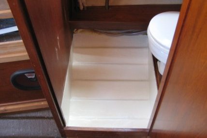Keulakajuutan korotetun lattian alla oli suuri tyhjä käyttämätön tila. Teimme tähän tilaan vetolaatikon, jossa voi säilyttää esimerkiksi kenkiä. Lisäksi vedimme asennusputken laatikon alapuolelle ja asensimme kaiuttimen johdot siihen. Aiemmin kaiuttimen johdot kiersivät keulan kautta, joten saimme sieltä johtokourun kokonaan pois.