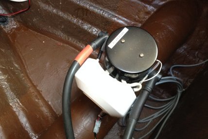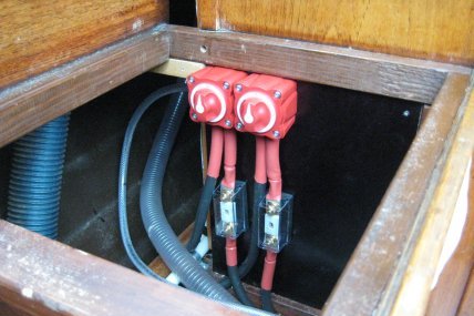 Johdotuksessa käytettiin Radaflexin 70 neliömillimetrin vahvuista monisäkeistä kuparikaapelia. Käytin kaapelin paksuuden laskemiseen Maritim 2016 luettelon kaavaa, jossa pienin suositeltava kaapelin pinta-ala (neliömillimetreinä) saadaan kertomalla kaapelin pituus (metreinä) virran voimakkuudella (A) ja luvulla 0,044. Potkurin tehon ollessa 2 kW sain virraksi 12 voltin järjestelmässä 166,67 A. Kuuden metrin kaapelin pituudella sain pienimmäksi suositeltavaksi kaapelin pinta-alaksi noin 44 mm2 eli käytännössä 50 mm2 kaapeli olisi riittänyt. Varmuuden vuoksi valitsin Radaflexin 70 neliömillimetrin monisäkeisen kuparikaapelin. Koska kyseinen kaapeli on kohtuullisen taipuisaa, asennus oli helppoa. Keulapotkurille asensimme kaapelit keittiön kaapin taakse ja siitä eteenpäin vaatekaapin alta keulavuoteen alle. Suunnitteluun meni kuitenkin yllättävän paljon aikaa.