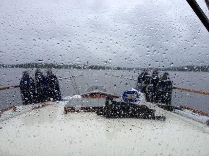 Ennen kuin saavuimme laituriin alkoi satamaan ja tuulemaan. Onneksi sade loppui melko pian ja päästiin yrittämään rantautumista. Ainoastaan rannan puoleinen kylki laiturista oli vapaana ja tuuli työnsi venettä laiturista pois päin. Muutaman kerran yrittämisen jälkeen onnistuttiin pääseemään onnellisesti laituriin.