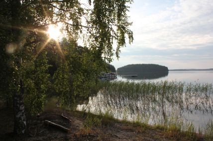 Aamuauringossa Petrisaaren rannalla. Voit myös katsoa kuvaamani videon, jossa tulemme Petrilahden retkisatamasta kapean kaislojen reunustaman salmen läpi takaisin Puruvedelle.
